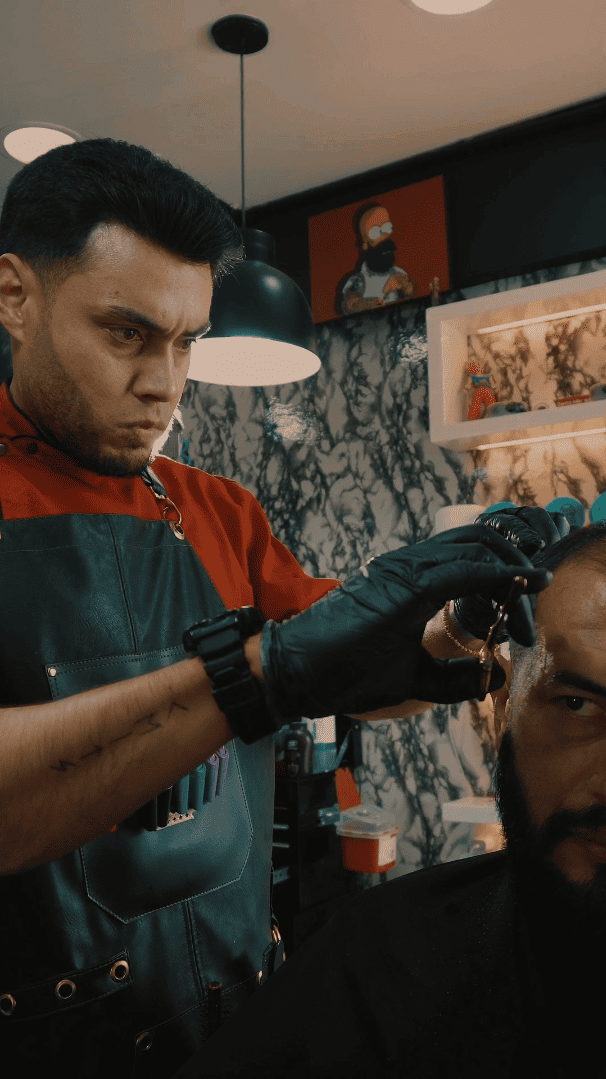 Sesión de fotos con edición detallada para resaltar el trabajo de los barberos y la atmósfera del lugar.