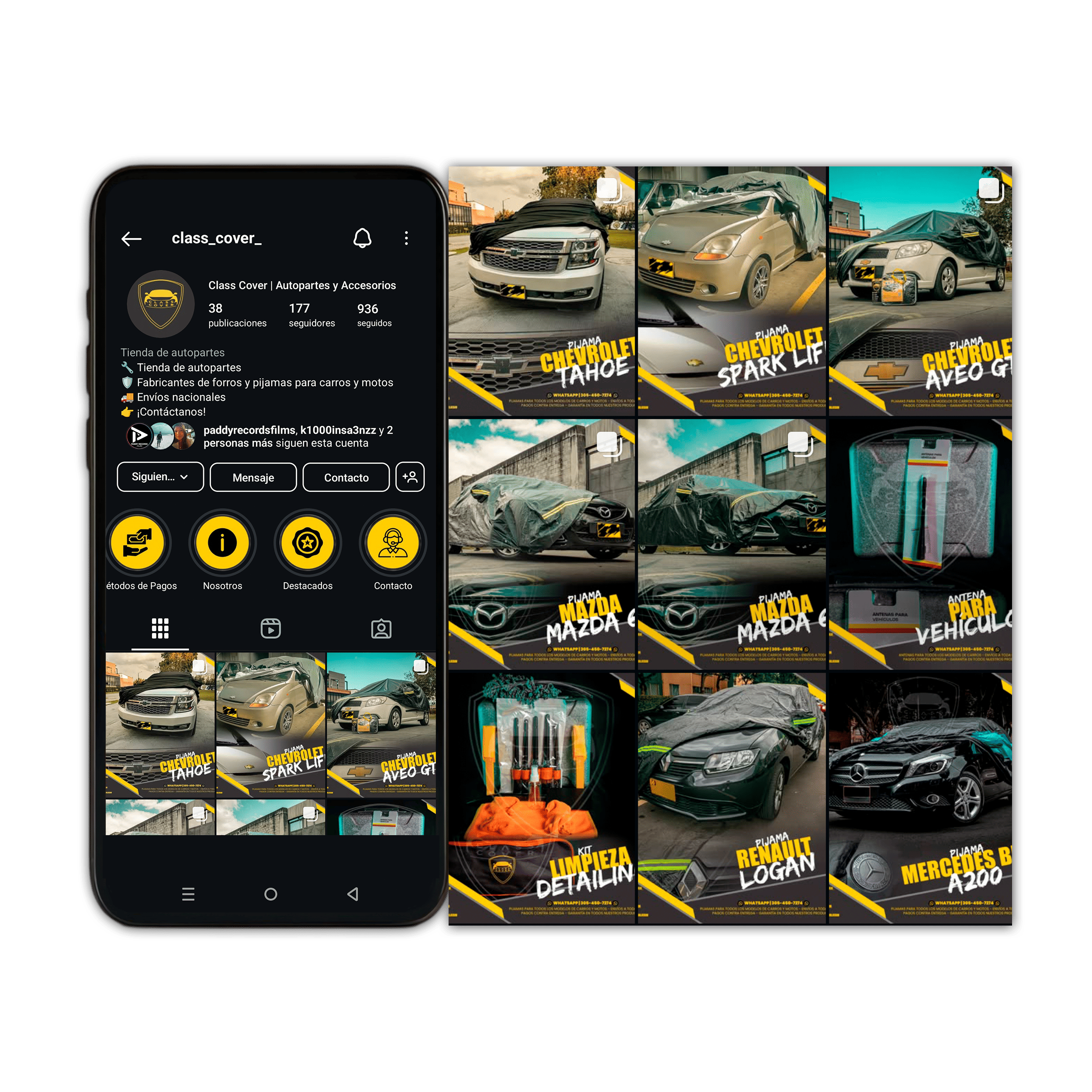 Diseñé estas historias destacadas con un enfoque visual atractivo y funcional, pensando en la experiencia del usuario. Cada historia responde a las preguntas frecuentes de los clientes, como datos de contacto, opciones de consignación y bancos disponibles, entre otros. Estas historias no solo resuelven dudas, sino que también refuerzan la identidad de Class Cover, demostrando capacidad para combinar diseño y utilidad en la creación de contenido digital.